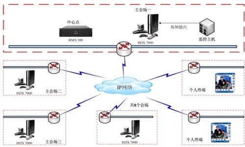 整個(gè)系統(tǒng)包括企業(yè)總部主會(huì)場(chǎng)、10個(gè)下屬分會(huì)場(chǎng),以及為高清視頻會(huì)議系統(tǒng)提供接入、控制和服務(wù)的控制中心。視頻會(huì)議的所有終端都要和多點(diǎn)控制單元MCU建立連接,通過(guò)MCU進(jìn)行高清視頻圖像的交換,高清語(yǔ)音的混合播放。